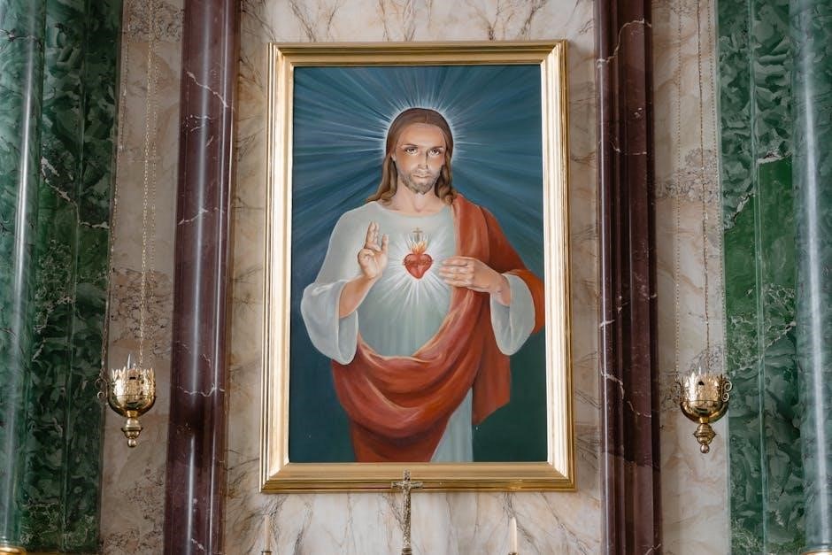 The Sacred Heart of Jesus is a central symbol in Catholic devotion, representing divine love, mercy, and redemption. It embodies Christ’s passion and sacrifice, inviting believers to reflect on His boundless compassion. The Sacred Heart is often associated with themes of reconciliation and divine mercy, serving as a powerful reminder of God’s love for humanity. This devotion fosters a deeper personal relationship with Christ and encourages believers to live with gratitude and humility. Its significance is deeply rooted in Catholic spirituality, making it a vital element of prayer and worship.